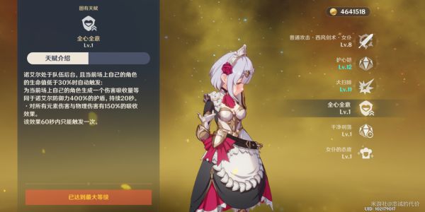 三命,元素战技提高三级。值得一提,毕竟元素战技是诺艾尔最重要的战斗天赋,优先升级,其他战斗天赋甚至可以完全不升。