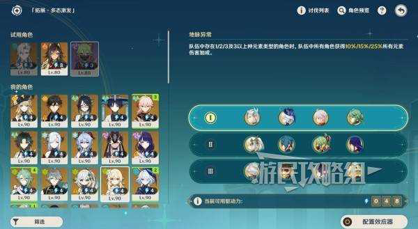 ※根据所选队伍选择适合的增益,带盾的话次级优先选护盾庇护下所有元素伤害+50%,初级则可以根据队伍和练度较低的角色选择补充属性。注意要根据自己的I、II、III队来选择对应的增益。下文增益根据上文的低配阵容来选择(配图为全角色阵容增益参考)。