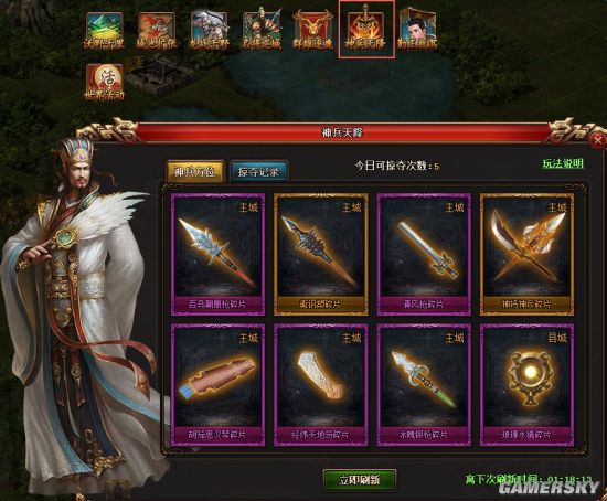 1.碎片刷新:每天9点、12点、18点,自动刷新神兵碎片目标。使用30礼金/元宝可立即刷新。
