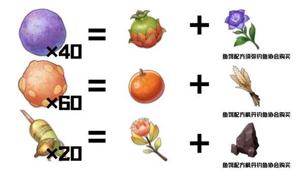 鱼饵在炼金台制作,一次制作会出产十个鱼饵!千万别一股脑合多了,获取满精「灰河渡手」大概需要40甘露饵+60酸橘饵+20维护机关频闪诱饵(需要稍微多合一点,因为有几率钓到观赏鱼,会跃出水面的就是观赏鱼)兑换的配方需要背包使用后才可以在炼金台合成,配方在钓鱼协会处兑换。
