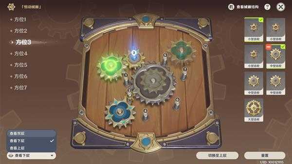 2.不同层的齿轮之间无法直接相互接合,我们可以通过切换查看上、下层来判断如何组合齿轮使其运作。