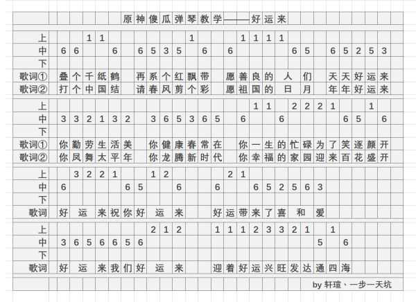 《原神》中风物之诗琴是当时风花节活动所兑换出来的道具,可以进行歌曲的演奏,那么好运来该怎么演奏呢?现在为大家带来“轩瑄丶一步一天坑”的《原神》好运来演奏谱分享,希望对大家有所帮助。