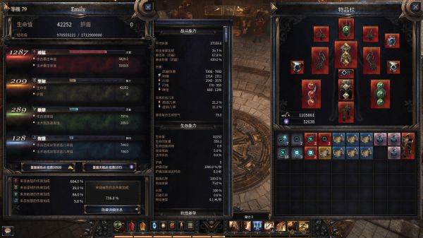 面板和装备(装备大部分都是100级左右的,有很多都是从黄装升级成红装的,有1件肩膀和1件手臂是177级的,为什么我有177级的装备后面会说,这也是我觉得这个游戏目前做装备更新装备的方向)